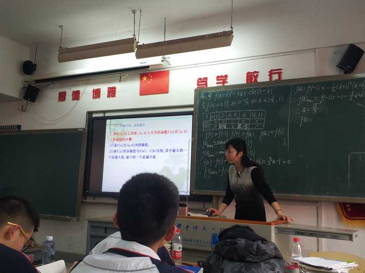 张老师带来的是一堂概念课。首先,张老师带领着学生回顾导数与单调性的关系,并从充分性和必要性两方面进行辩证说明。其次,张老师自然地过渡到用导数来判断极值,并强调导数在极值两侧异号。再引出最值的概念,由以前的定性描述过渡到现在的定量定义,着重强调第二个条件“能取到”同时,类比均值不等式的“能取到”条件。接着,再从函数图像的角度出发,得出一些最值的有关条件,比如,区间的开闭,函数的连续等等。然后,再由小组讨论的形式,探讨“函数的最值和极值的区别与联系”,让学生清晰地意识到,函数的极值(附近)和最值(整体)是两个不同的概念。最后,通过几道例题,示范求最值的完整步骤和方法,再和学生一起进行总结。课后,全体成员在办公室和叶老师、张老师进行了进一步的交流、探讨,大家都受益匪浅。