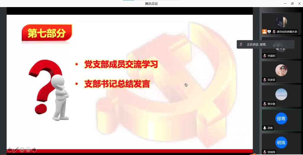9月26日晚上,我院2020级研究生第二党支部于腾讯会议召开了9月主题党日活动。本次活动主要由5个部分组成,分别是学习党章---党的纪律检查机关部分,学习第二十七次全国高校党的建设工作会议精神,学习贯彻习近平总书记给全国高校黄大年式教师团队代表重要回信精神,优秀党员事迹学习以及时政热点学习。党支部全体17名正式党员以及4名预备党员参加活动。本次活动由党支部成员唐浩松同志主持。