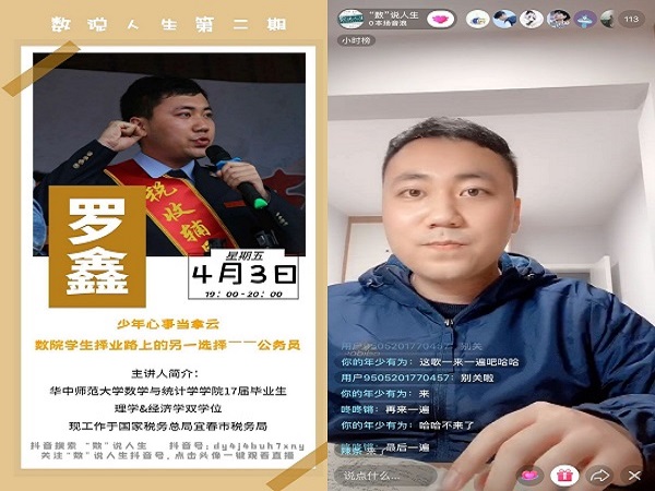 (通讯员 罗瑞佳)数学与统计学学院(以下简称“数院”)17届毕业生罗鑫,拥有理学和经济学双学位,现工作于国家税务总局宜春市税务局。4月3日晚,他通过抖音在线为数院学子分享公务员行业的有关知识,并讲述了自己的就业经历以及对学弟学妹的建议。该活动旨在让数统学院的学生居家期间能够通过网络直播,了解到更多与数学专业相关的就业方向和就业前景,提前为自己今后的择业做好准备。