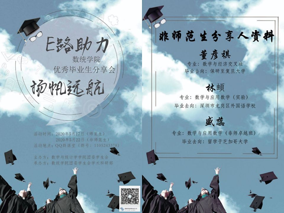 (通讯员 江余寒)5月22日晚,数学与统计学学院(以下简称“数院”)团委学生会在QQ群课堂中开展了非师范类优秀毕业生分享会,旨在帮助同学们对当前社会形势、就业情况有更深入的了解,同时也激励了在疫情期间居家学习的同学们,希望数统学子们对待学习不松懈,不断提升自己。在此次分享会中,数院团委学生会邀请到了数院2016级优秀毕业生董彦祺、盛蕊以及林頔,他们三位分别就保研、留学、就业三个方面进行了分享。
