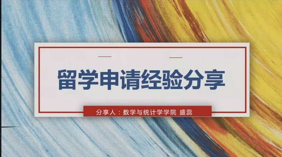 第二位分享人盛蕊,来自数学与应用数学非师范类卓越班,毕业后将留学于芝加哥大学。盛蕊首先对进行了自我介绍,然后向同学们介绍了留学申请的硬实力与软实力。硬实力即GPA与托福、GRE成绩,软实力则可从实习、科研活动、比赛、奖学金等方面提高。盛蕊也通过提出的几个问题分享了自己申请出国留学的经历,感性地讲述了自己的心路历程,给予了有留学想法的同学鼓励。