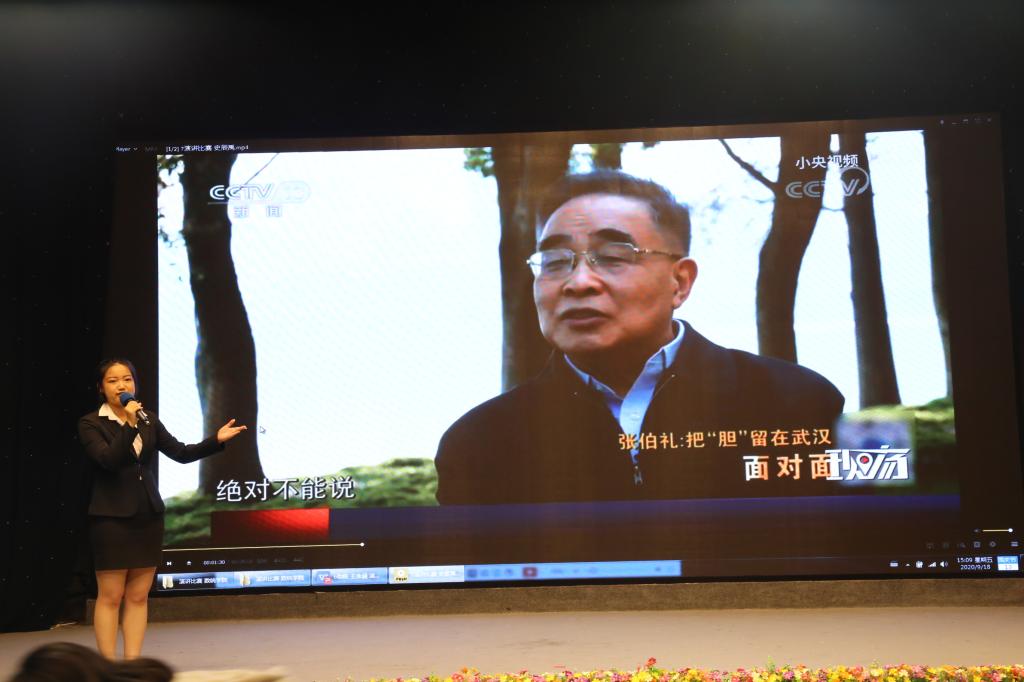 紧接着,第七位上场的选手就是史辰禹,她演讲的主题是“江山如故,黄鹤归来”。她通过疫情期间一直飘扬的网红窗帘引入演讲,发表了她对于疫情期间中国人民的表现的思考与感悟。在她的演讲之中,有为一国而封一城的英雄城市武汉,有与武汉“肝胆”相照的张伯宇院士,有“因为我穿着防护服,所以我不能哭”的朱海秀,有社区的志愿者,有居家隔离的每一个平凡人。史辰禹通过对每一个人的努力,刻画了战疫路程的艰难。在她演讲的最后,她说:“看到有些拥挤的二号线和人声鼎沸的校园,我心底有无限的感动,感动江山如故,白云尚在,黄鹤归来,汉阳树仍然郁乎苍苍,鹦鹉洲依旧芳草萋萋。”