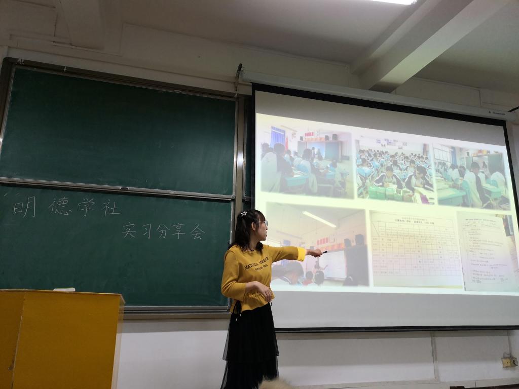 分享会伊始,宋帅向与会人员介绍了本次分享会的主讲人高红叶和文舟舟,并对他们的到来表示欢迎。紧接着第一位主讲人高红叶进行实习分享。高红叶用“选我所爱,爱我所长,爱我所选,圆我所梦”来概括她实习过程的心得体会,之后从“个人简介”、“教学工作”、“班主任工作”、“找工作”四个方面进行详细的讲解。在教学工作方面,她表示:“在实习过程中,谦逊是非常重要的,我常常觉得自己像是一块砖,哪里需要就往哪搬。经过锻炼,我慢慢地从刚开始的什么都不会,到后来能自己阅卷上课,这个过程是艰辛的,却更是有意义的。”在班主任工作方面,高红叶认为作为班主任需要有家长的胸襟、园丁的辛勤、朋友的姿态以及恋人的付出,这样才能更好地处理师生关系。而在找工作方面,她认为重要的是要清楚地了解自己想去哪、能去哪、该去哪。