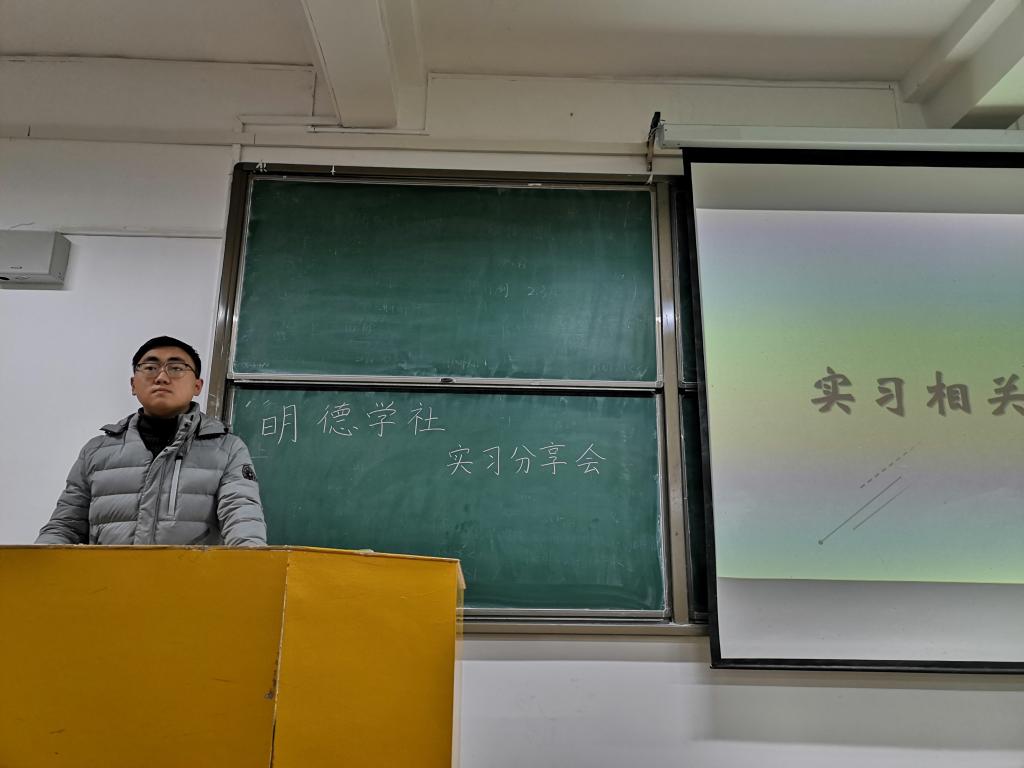 (通讯员 田宇格 张洪涵)12月13日下午,第六届明德学社实习分享会在数学与统计学学院6201教室顺利举行。本次实习分享会由博雅优秀学生奖学金、树人奖学金、校级三好学生获评者高红叶以及博雅丹桂奖学金、校级海外交流奖学金、校级三好学生获评者文舟舟主讲,旨在帮助社员更加深入地了解实习情况,分享实习经验并给出实习建议。明德学社社长宋帅,副社长陈恺睿、越怡宁、周蕊桢等理事会成员及第六届明德学社全体社员参与了本次分享会。