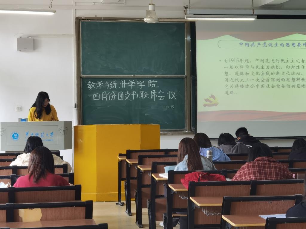 (通讯员 唐佳骏)4月15日中午,数学与统计学学院(以下简称“数统学院”)四月团支书联席会议于六号楼6201教室举行。本次联席会议以“重温党史忆初心,共话传承担使命”为主题,旨在让各团支部了解中国共产党的历史并学习中国共产党革命征程上的宝贵品质。同时,此次会议邀请上月组织了优秀团日活动的班级进行经验分享。数统学院团委副书记袁瑞祥,组织部全体成员及19、20级团支书出席此次会议。