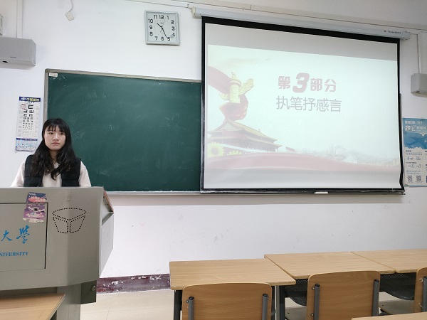 (通讯员 龙佳琪)3月21日上午,为提醒同学们了解国家政事,牢记先烈“不畏艰难,勇于奋斗”的革命精神,缅怀卫国戍边英雄,并进一步提升数学与统计学学院(以下简称“数统学院”)学子的历史责任感和民族使命感,数学与统计学学院1901团支部于6207教室开展“致敬卫国戍边英雄”主题团日活动。本次活动由1901团支部宣传委员龙佳琪主持,1901团支部全体成员参与此次活动。