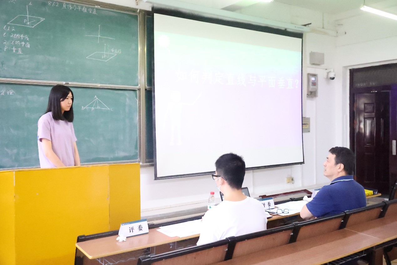接下来,比赛进行第二环节——模拟授课和教学设计思想阐述。选手们根据自己制作的教学设计以及多媒体课件进行10分钟的模拟授课,教室内所有参赛选手作为模拟学生配合上课。最后进行4分钟的教学设计思想阐述以及回答评委的提问环节。选手们分别就“直线与平面垂直的判定”、“指数函数的概念”、“点到直线距离公式”等主题进行模拟授课。