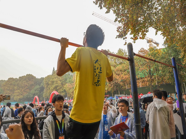 选手们在刚开始时还比较轻松,但当最后体力不佳时,为了能争取多做一个,只能深吸一口气,咬紧牙关,绷紧自己的肌肉,再努力向上。每完成一次标准的引体向上,就是对自己的一种挑战。在场的观众也是热情似火,用力欢呼呐喊,为选手们加油打气。湿滑的单杠没有磨灭他们的信心,雨滴也没有浇灭他们的热情。 经过了一个多小时的激烈竞争,男子引体向上比赛落下帷幕。最终,数统学院以297个的成绩荣获第一名。