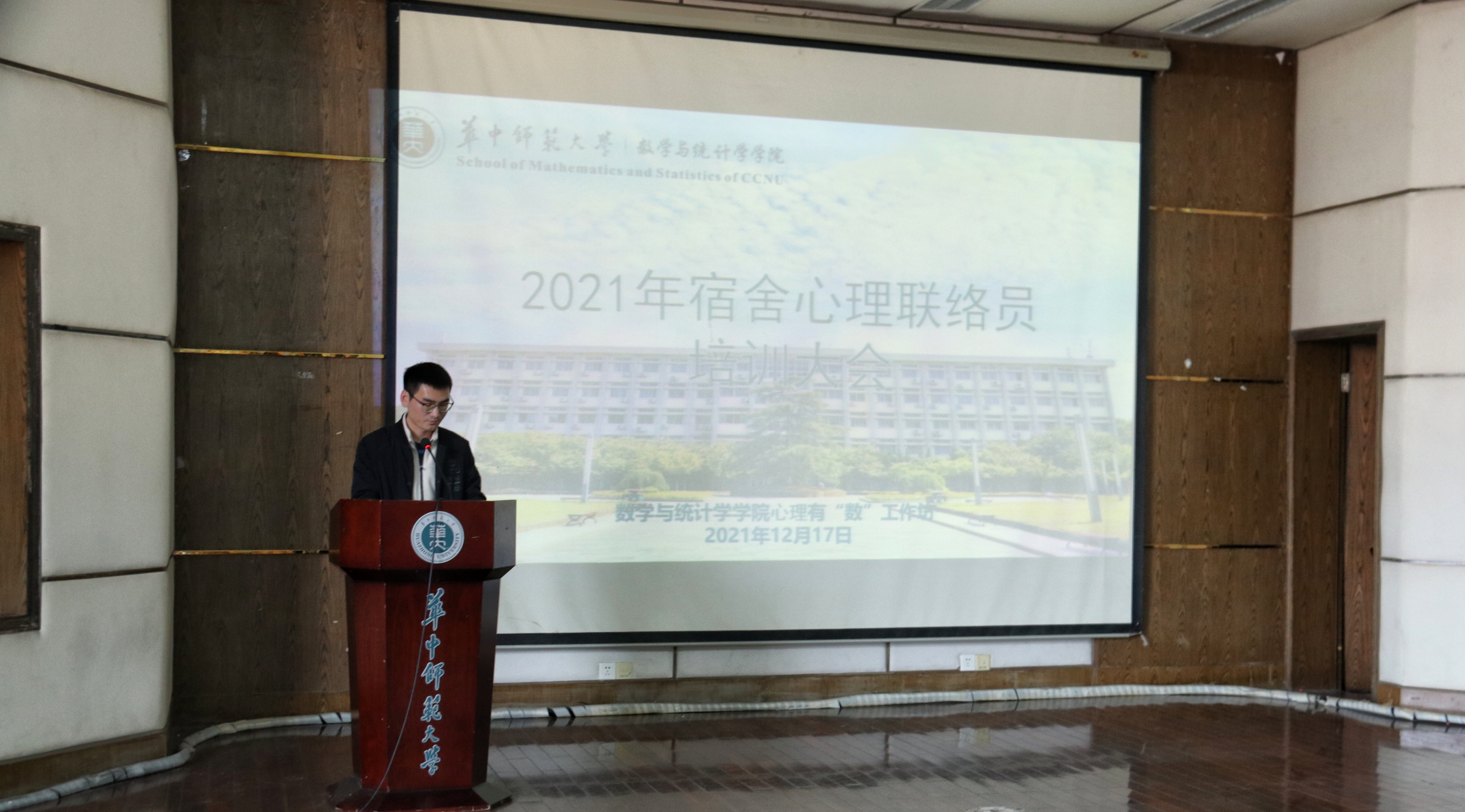 (通讯员:赖道毅 胡姿影 程佳薇 傅果勇)为进一步完善心理健康教育四级网络工作体系,发挥宿舍心理联络员群体工作力量,增强广大学生群体的心理自助能力,12月17日下午,数学与统计学学院(以下简称“数统学院”)2021年宿舍心理联络员培训会议在九号楼一楼报告厅顺利举行。数统学院党委副书记田俊、学校心理健康教育中心专职教师段文婷、数统学院2021级辅导员龙星宇参加会议。会议由数苑心理有“数”工作坊指导老师张路阳主持。此次培训特别邀请了武汉科技大学心理健康教育中心专职教师梁晶晶作主题讲座。数统学院2020级、2021级全体宿舍心理联络员参加此次专题培训。
