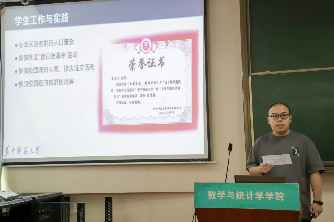 (通讯员 李欣雨)为做好国家奖学金评审工作,充分发挥奖学金的引领作用,10月8日,数学与统计学学院(以下简称“数统学院”)2023年本科生国家奖学金答辩会在六号楼6401报告厅举行。数统学院党委书记刘成竹,院长周远扬,副院长郑高峰,党委副书记田俊,班主任代表蒋代军、安丽想、邓清泉、王春花、王书晶、李乐、宁建辉、帅伟、李娜、郭思培、刘创业、邓勤涛、曲连强、刘梦雅、龙旸靖、蒋咪娜、陈双、罗勇、邓国泰、段然、李佩彦、李正帮,全体本科生专兼职辅导员以及各班学生代表出席本次答辩会。答辩会由辅导员申墁烨主持。