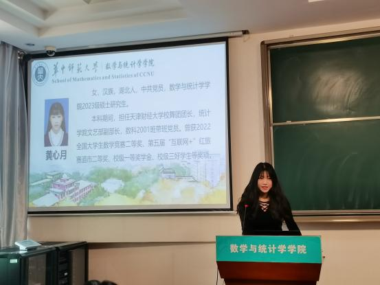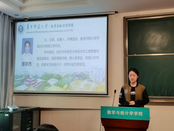 会议第四项,数统学院第十二届研究生会主席团成员徐子贤宣读《华中师范大学数学与统计学学院研究生会2022-2023学年工作报告》。她回顾了过去一年以来研究生会在制度改革、学术发展、文体活动等工作中取得的成效,并针对如何进一步筑牢思想建设、加强内部管理、创新工作方法进行了展望,希望新一届研会成员能团结一致,全心全意服务师生,为学院蓬勃发展贡献力量。