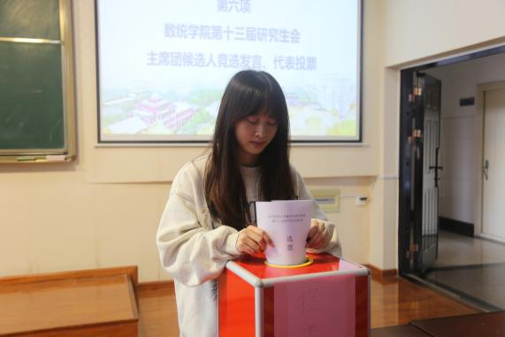 会议第六项,数统学院研究生会第十三届主席团候选人竞选发言、代表投票。四位候选人依次从个人信息、学生工作经历、个人能力优势、未来发展规划等方面进行竞选演讲,充分展现出数统学子勇于担当的工作意识和砥砺奋发的青春魄力。