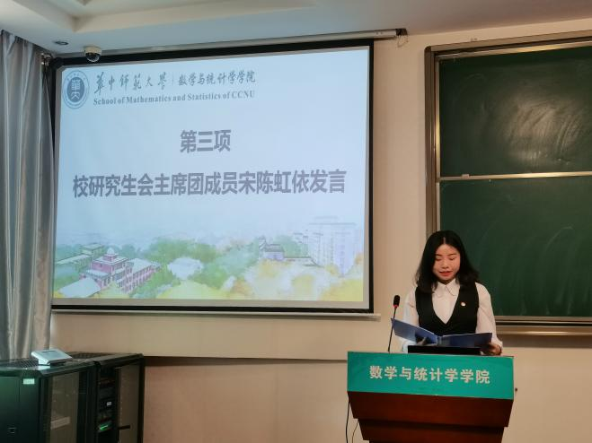 会议第三项,校研究生会主席团成员宋陈虹依发言。她首先对数统学院第十三次研究生代表大会的召开表示诚挚祝贺,并充分肯定了过去一年间数统学院研究生会的各项工作。最后,她对研究生会未来的工作提出希冀,希望数统研会成员勠力同心,为学校建设、学院发展建睿智之言、下务实之功、求满意之效,发挥好桥梁纽带作用,团结带领广大同学在新的征程中砥砺奋进。