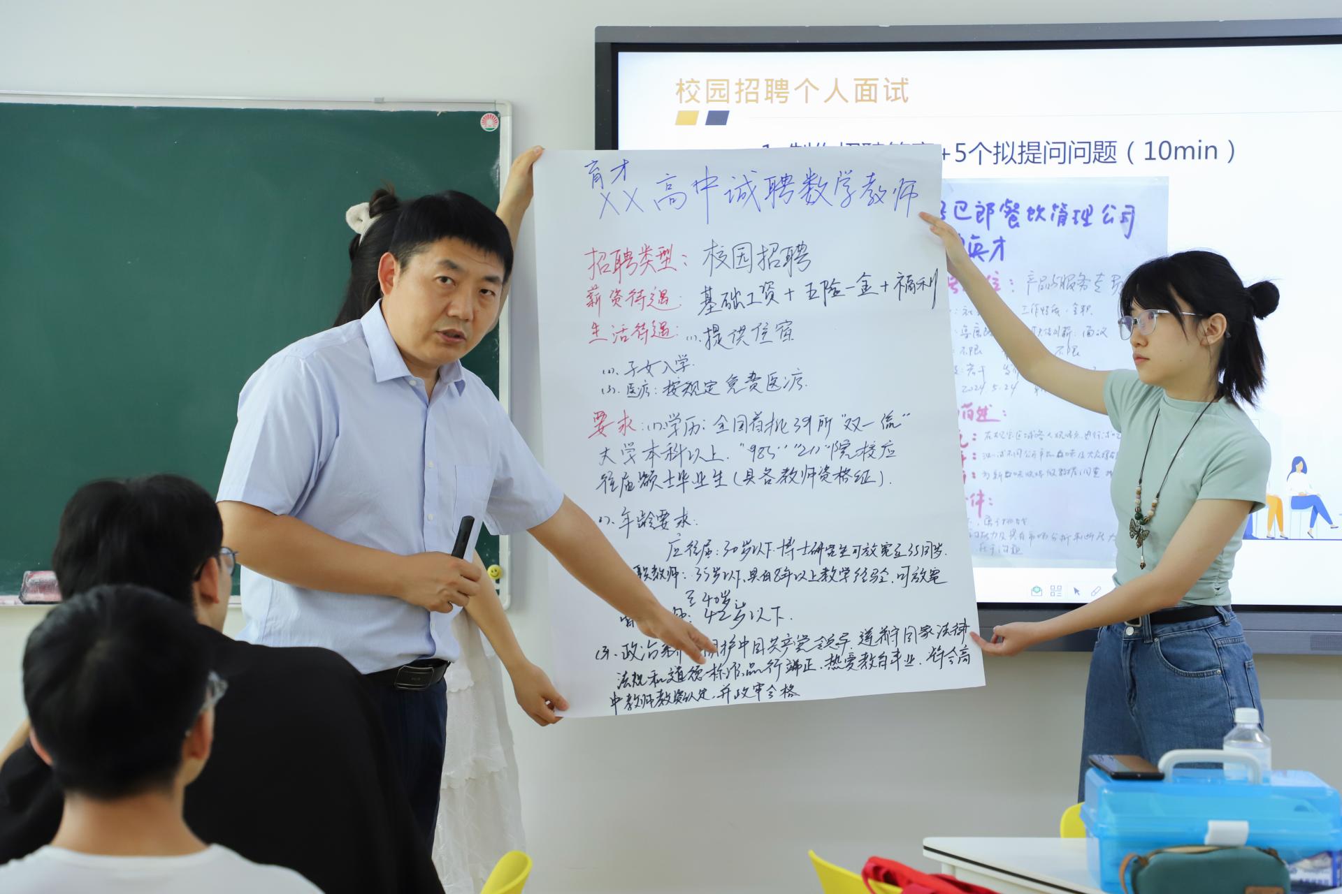 丁玉斌首先介绍了教师招聘的基本流程,并着重强调了职位胜任力的重要性。在自我介绍板块,丁玉斌引导学员从意向求职岗位和自我优势出发,准备一分钟自我介绍,黎环等五位同学逐一进行分享。丁玉斌在点评中指出,语言表达是自我介绍的核心与基础,自我介绍的内容要符合职位的竞选要求,要有逻辑、有重点、有亮点。