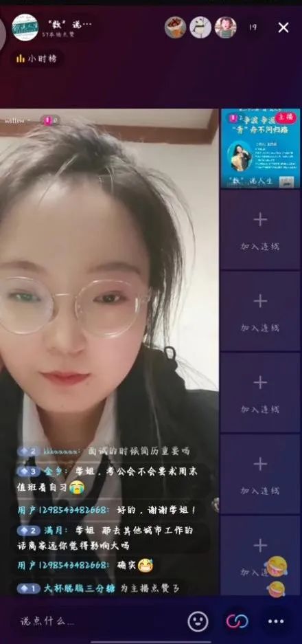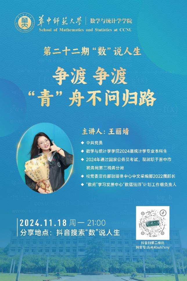 (通讯员 安瑶)为构建学院高质量就业指导服务体系,强化生涯教育,加强就业指导,帮助学生深入了解考公政策,获取备考经验,11月18日,数学与统计学学院(以下简称“数统学院”)第二十二期“数”说人生校友论坛于抖音直播间顺利举行。本期论坛由数统学院2024届统计学专业本科毕业生王丽婧进行分享,由2021级本科生辅导员武靖主持。