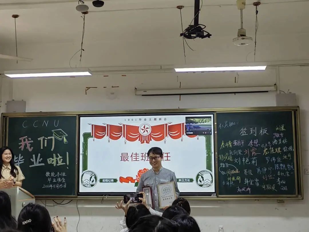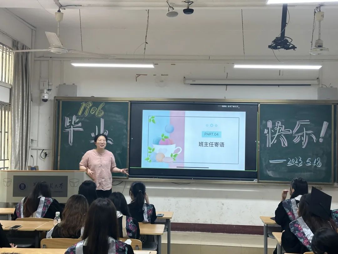5月29日下午,1903班毕业班会顺利举行。同学们聚在一起回顾了大学四年全班一起经历的酸甜苦辣,观看了每位同学大学四年变化的变装视频,看到曾经青涩的自己,每位同学都感慨大学四年过得真快。到了同学互换明信片的环节,每位同学都为彼此送上了真挚的祝福,千言万语化成祝彼此前程似锦。班主任张正杰老师也为同学们送上寄语,他希望同学们未来一切顺利,事业与生活双丰收,走出华师校园,走上讲台,拥有幸福人生。