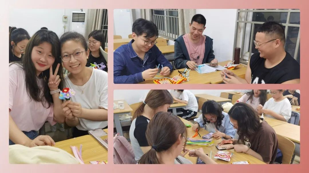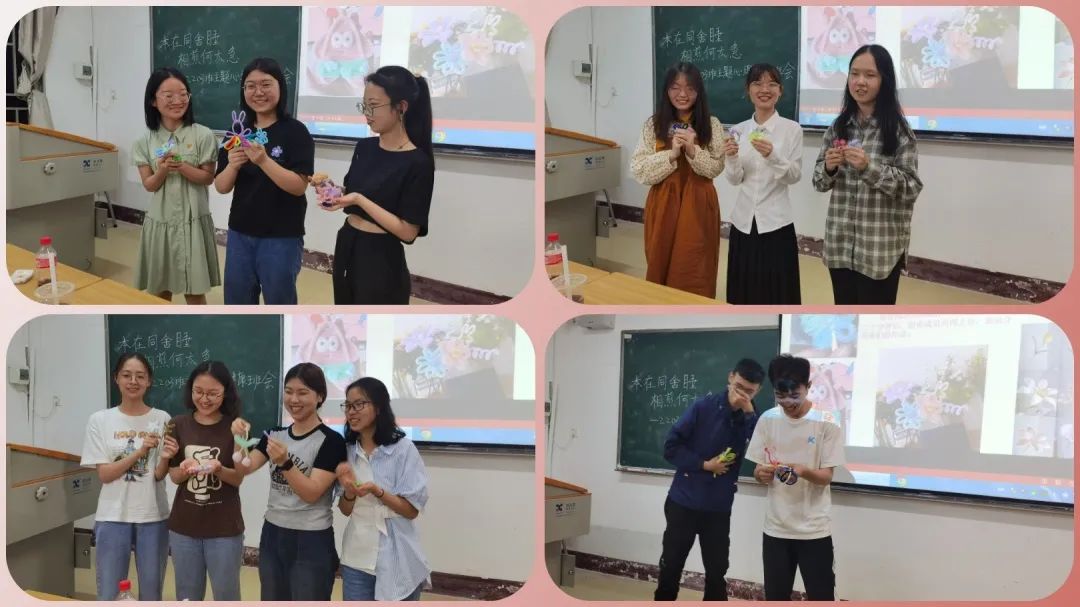 然后就到了我们的扭扭棒环节~以宿舍为单位分小组进行扭扭棒DIY制作。二十分钟后,按照小组依次上台展示,用打分收集表互相评分,给获奖小组发小奖品。同学们积极参与制作,班会氛围十分活跃。