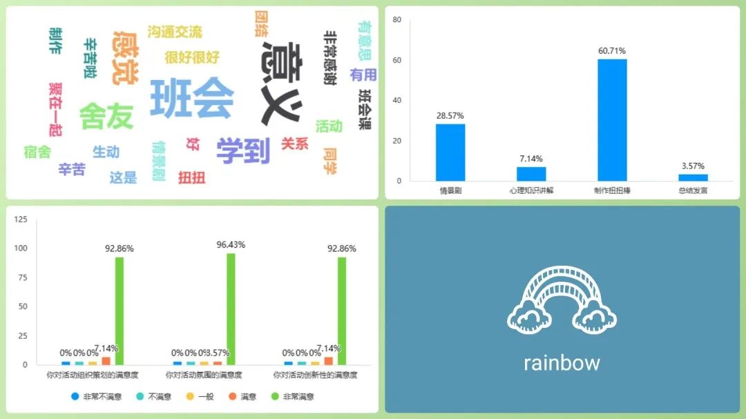 本次班会我感受颇深,在班会过程中我看到了不同宿舍的不同特点,有的宿舍偏向高冷风,有的宿舍比较热闹可爱,有的宿舍比较保守神秘…最惊喜的就是情景剧,氛围感拉满,班主任也是很和蔼活泼地参与到各个宿舍小组中。很赞!