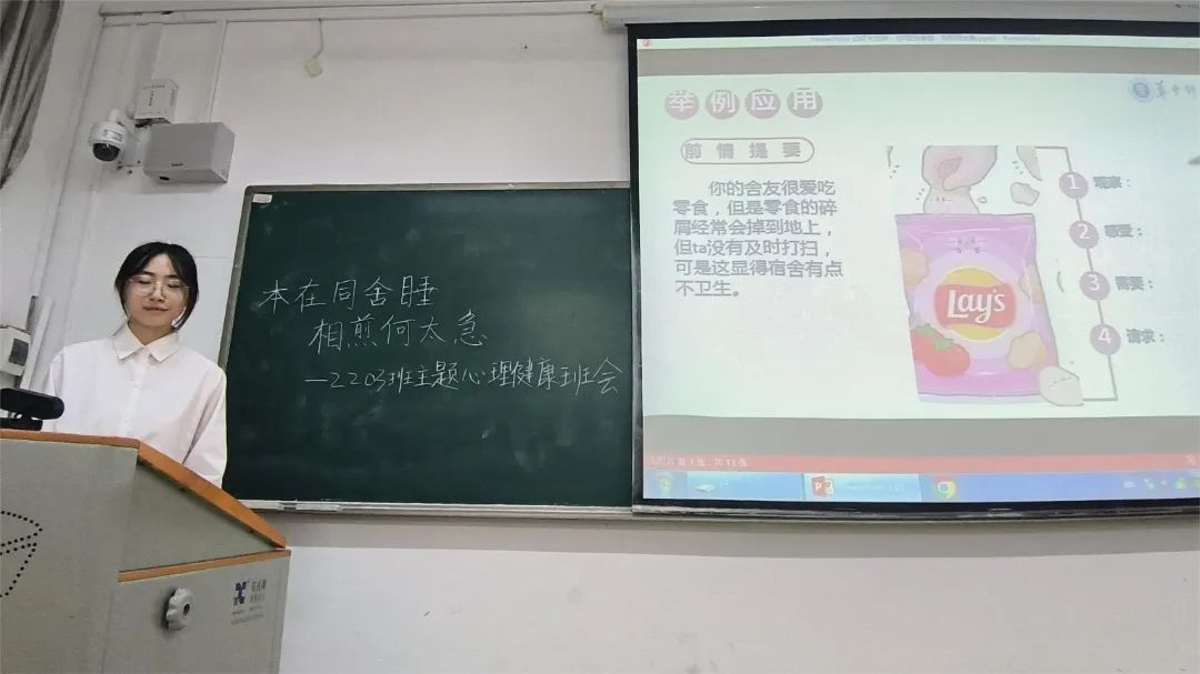 (通讯员:郭文瑾 李腾文桦)为加强班级的宿舍和谐,营造团结、互助、友爱的学习生活氛围,数学与统计学学院2203班于5月13日在六号楼6209举办“本在同舍睡,相煎何太急”——舍友间和睦相处的正确沟通方式主题心理班会,同时邀请班主任程婷老师一同参与、互动,促进师生交流与了解。