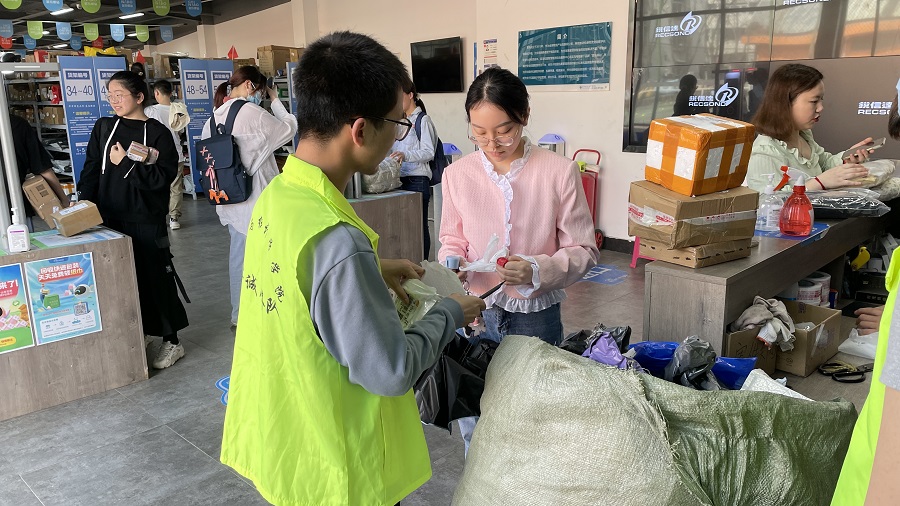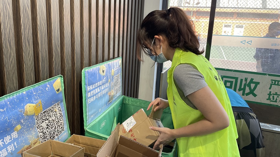另一名志愿者在菜鸟驿站回收纸盒处整理堆放的快递盒,将快递盒和缓冲材料分拣出来,整齐地放在回收箱中,便于工作人员回收利用。随后,志愿者将剩下的快递包装袋和生活垃圾经过整理,统一丢入到垃圾袋中。