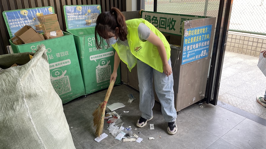 活动结束后,志愿者用扫帚将地面的垃圾再次打扫干净,使菜鸟驿站取件环境保持整洁,并且减轻了工作人员的负担。随后,志愿者将志愿马甲和劳动工具放回原位并依次离开。