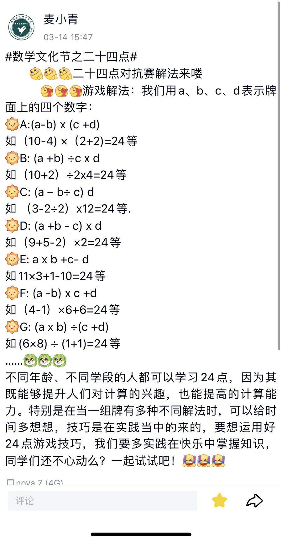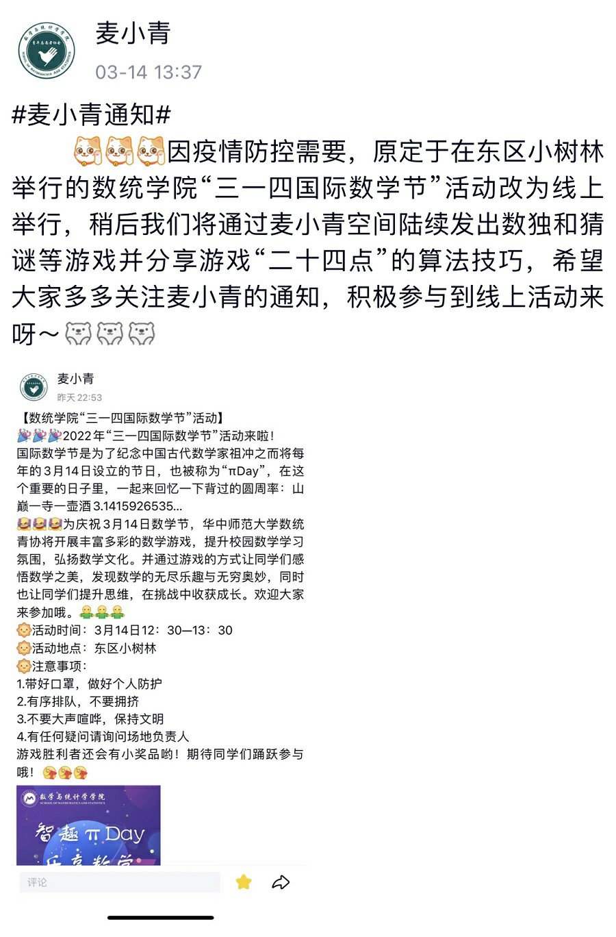 华大数统 (通讯员 白婧) 为庆祝“三一四国际数学日”,华中师范大学数学与统计学学院青年志愿者协会(以下简称“数院青协”)于3月14日开展线上数学游戏活动。内容包括发布丰富有趣的数学游戏,分享数学游戏小技巧等,吸引了众多同学参加,本次活动在校园中营造了学习数学的良好氛围,弘扬了数学文化。