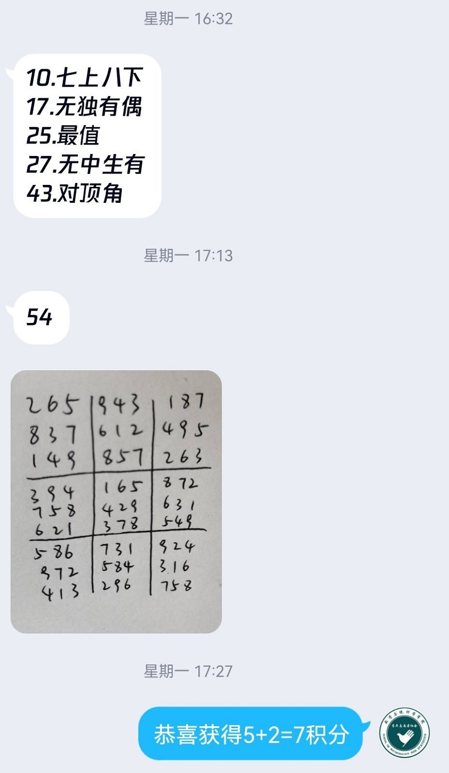 活动当天,负责人首先将活动开展的方式用官Q麦小青发布,便于让同学们对其有清晰的了解并积极参与进来。随后,志愿者分别推送了三个游戏(数独、二十四点、数字谜语)的相关规则以及题库。活动中,同学们在线上参与活动答题,完成作答后将自己的完成情况通过拍照等方式发送给麦小青。随后,由相关志愿者统一检查并记录同学们的作答情况并一一回复他们所获得的积分。在同学们的作答情况被审阅后,第三组志愿者便统计好积分,按照规则的积分分段为同学们发放奖品。
