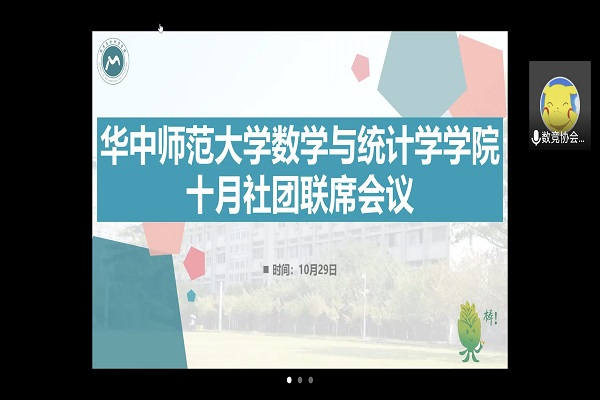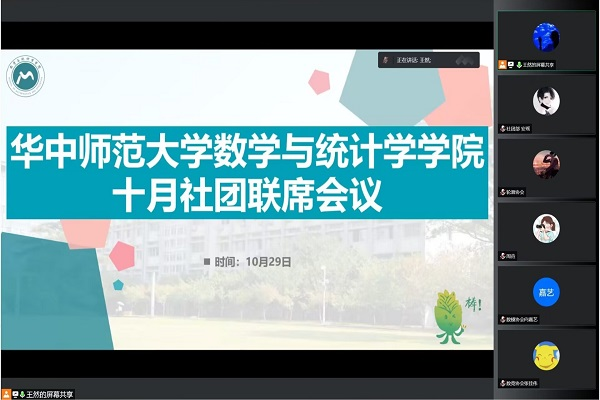 (通讯员 董嘉怡)为推动社团文化建设,吸纳新鲜血液,10月29日晚,数学与统计学学院(以下简称“数统学院”)十月份社团联席会议于线上展开。数统学院主席团成员周垚、社团部全体负责人、全体数统学院挂靠社团代表出席本次会议。社团部负责人王然主持会议。