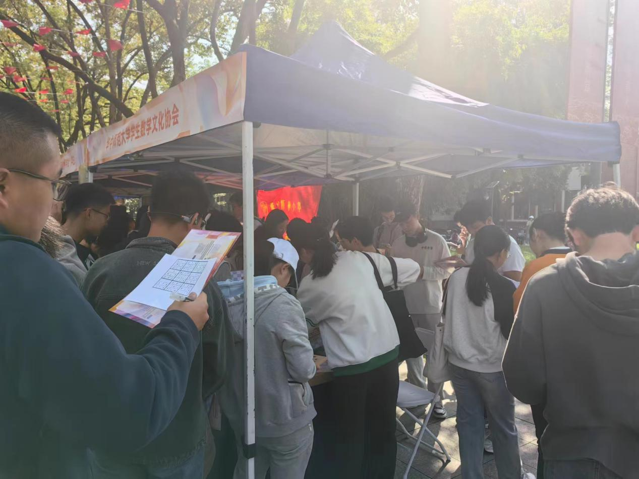 数学文化协会策划了前期的线上转发抽奖活动以及众多益智游戏,包括两人对弈五子棋、数独解密、玩转魔方等游戏。配合着集章任务,精彩的数学游戏吸引了众多学生驻足摊前,最终数学文化协会新增五十余名社员。