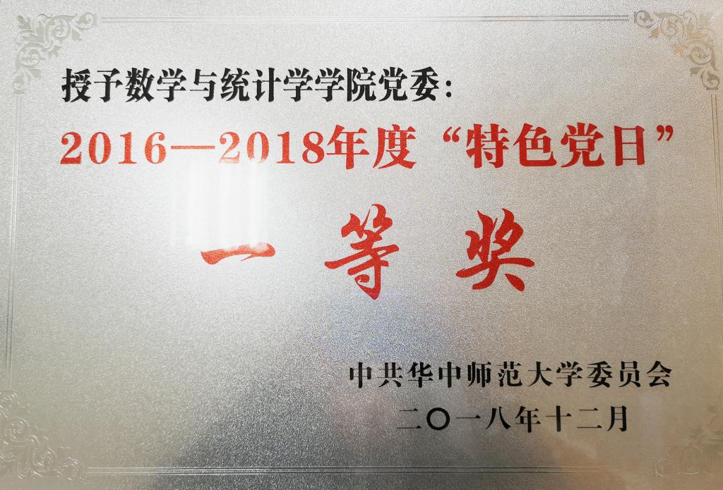 2019年1月17日,学校下发《关于表彰2016-2018年度“特色党日”活动获奖单位的决定》,经自主申报,评委会评审,共评选出“特色党日”活动一等奖8个,二等奖10个,三等奖17个。其中,数学与统计学学院被评为“特色党日”活动一等奖单位。