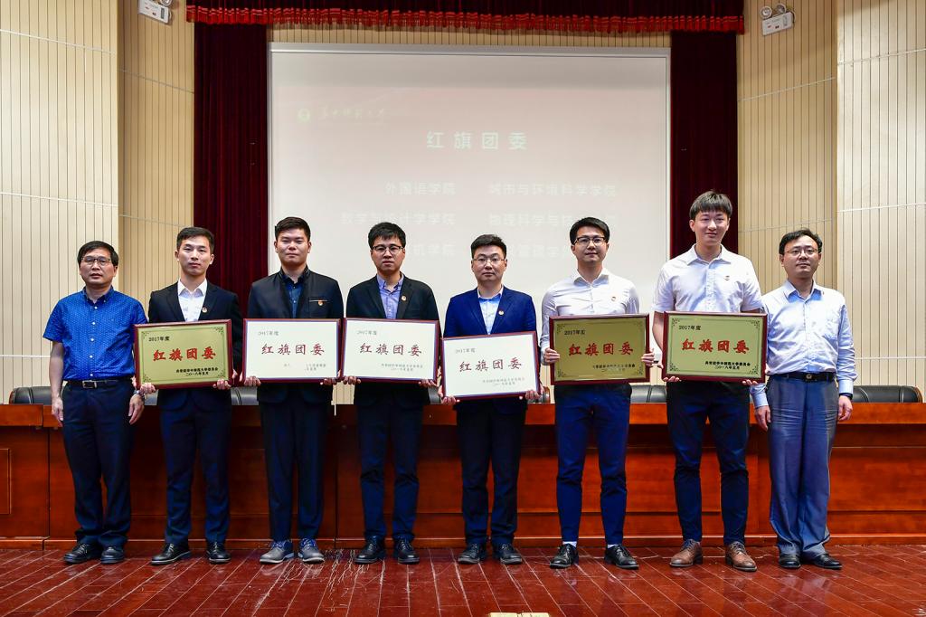 2018年5月4日下午,华中师范大学纪念五四运动99周年暨建团96周年表彰大会在科学会堂隆重举行。在此次表彰大会中,数学与统计学学院凭借突出的工作成绩,取得众多荣誉。数统学院团委以总分第二的成绩荣获“红旗团委”称号,数统学院学生会获得“2017年度标兵学生会”的荣誉称号,数统学院薛良平获得“2017年度优秀共青团干部标兵”的荣誉,数统学院党委副书记吴成峡被授予“重视共青团工作领导奖”。