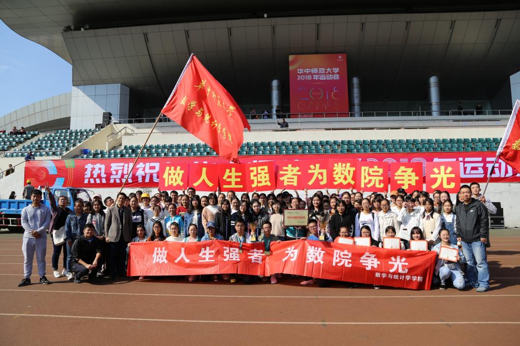 丹桂飘香,南湖浪涌,华中师范大学2018年秋季运动会已在佑铭体育场落下了帷幕。在校运会全程中,数学与统计学学院众人同舟共济,秉持着“做人生强者,为数院争光”的自强精神,齐心协力,披荆斩棘,以强者姿态,登顶荣耀之巅。不仅成功卫冕男子学生组团体冠军和女子学生组团体冠军,荣获四连冠,再创历史新高;而且在个人单项上涌现出一个又一个捍卫数院荣誉的英雄,也荣获体育道德风尚奖的称号。荣誉的背后,离不开运动员们的艰苦训练,离不开数院领导、老师们的支持和鼓励,同学们的加油呐喊,还有学生干部的一路陪伴和后勤保障的补给。佑铭的操场上,我们意气风发,坚定向前;我们团结一致,青春飞扬。佑看今朝,铭数院大志。