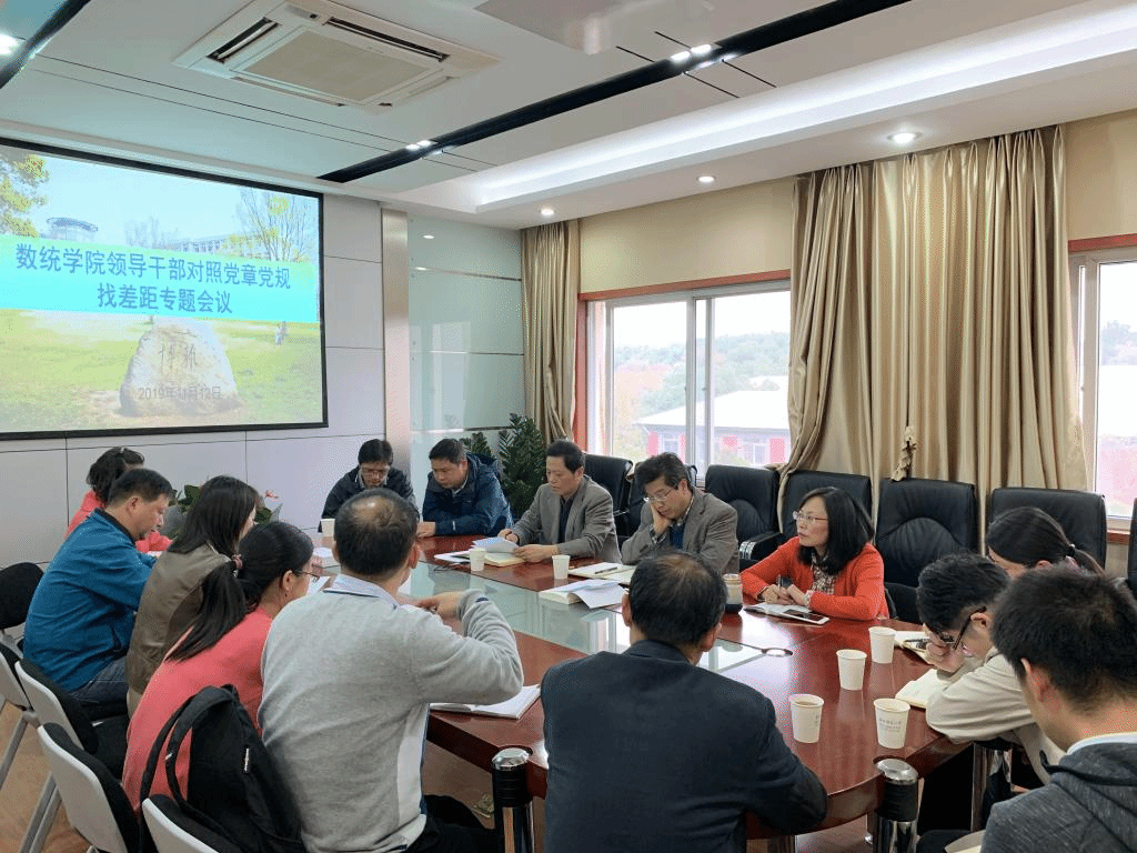 11月12日下午,数统学院党委中心组于六号楼四楼会议室开展了领导干部对照党章党规找差距专题会议。学校主题教育巡回指导小组第四组副组长黎俊玲、我院党委委员、中心组成员、教工党支部书记代表参加了此次会议,会议由党委书记王中主持。