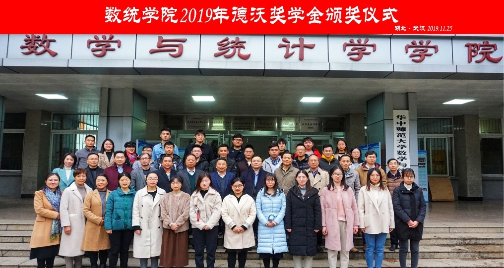 11月25日下午,华中师范大写数学与统计学学院(以下简称数统学院)2019年德沃奖学金颁奖仪式于六号楼6401教室如期举行。华中师范大学副校长夏立新,捐赠代表詹伟哉、韩燕军、惠岑、杨万维、尹平和张在武,校友代表韩敏、李筠、王茂胜、张小新和蔡丽娟出席颁奖仪式。此外,到场的还有数统学院党委书记王中,副院长刘宏伟,院党委副书记张军和学院各年级专兼职辅导员。颁奖仪式由院党委副书记田俊主持。