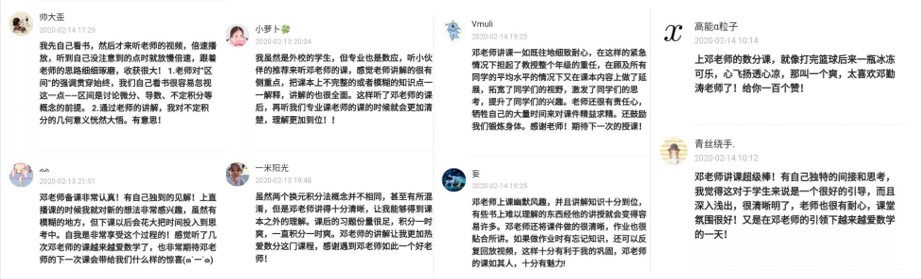 “宜学习、早起、运动、报网课;忌偷懒、开黑、吃鸡、打农药”,这是数统学院邓勤涛老师自2月10日开讲的《数学分析2》线上直播课报名页上的一句话,有趣的灵魂和渊博的知识吸引了校内外1055人在线学习。课程目前已直播七次,总体效果良好,为社会广大学生提供了高质量的学习资源。直播过程中,邓老师经常停下解答学生们的疑问,线上教学互动比线下更便捷,学生们交流热情也更高。数统学院2019级学生李秀璐在听过邓老师的在线课程后说道:“邓老师讲课时幽默风趣,会通过互动的方式了解学生的问题并及时解决。而且邓老师的每一堂课除了覆盖基本知识,还会有拓展延伸部分,上完课会保证大家都学有所获”。