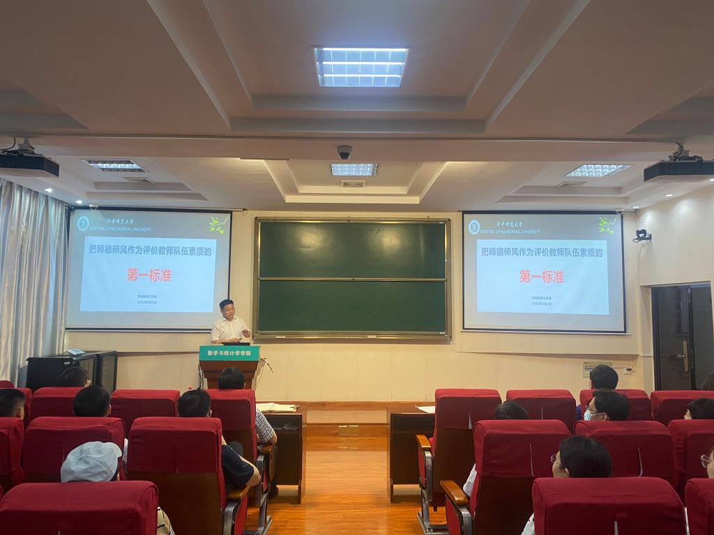 6月2日上午,学校党委教师工作部副部长李华忠在6号楼6401学术报告厅为数学与统计学学院全体教职工开展师德师风专题报告。会议由学院分党委书记刘成竹主持。
