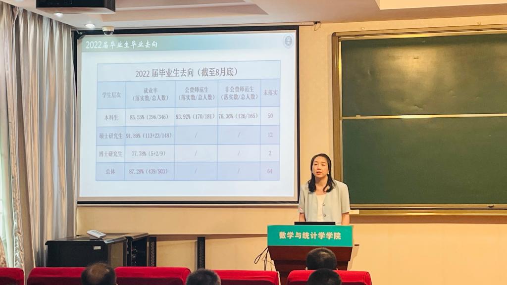 会上,副院长郑高峰总结了数学建模、数学竞赛暑期培训等工作情况,对新学期开学准备、实习指导等工作进行布置;副院长左国新通报了暑期公费师范生返校攻读教育硕士相关工作并就研究生招生、教学提出工作要求;副院长郭玉劲总结了国际合作及科研项目申报成绩,对学院科技人才培养的深层次问题进行了分析说明,对新学期工作进行了布置安排;院党委副书记田俊通报了2022届毕业生就业情况以及2022级本科新生基本信息。