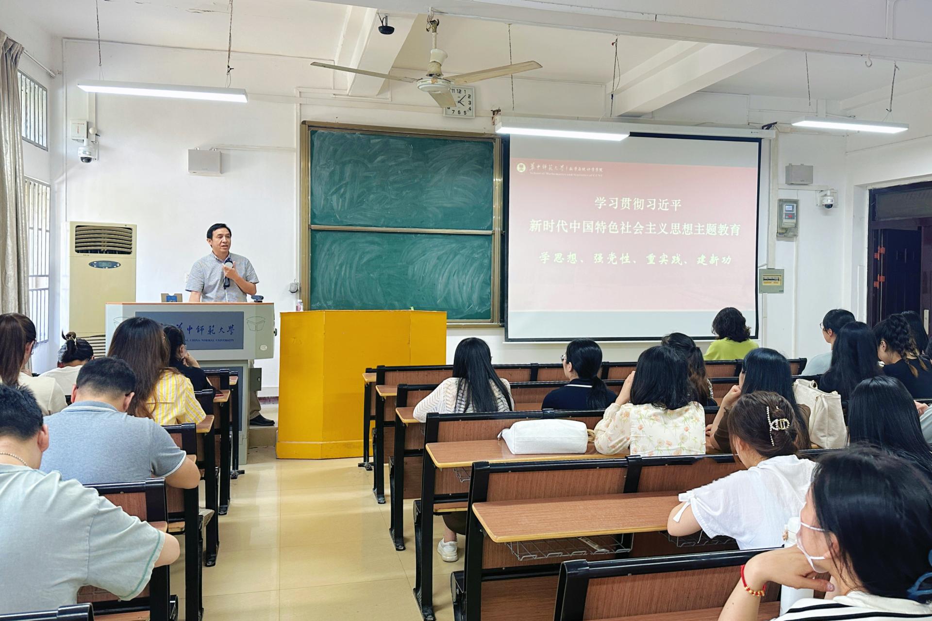 为深入开展学习贯彻习近平新时代中国特色社会主义思想主题教育,进一步学习贯彻党的二十大精神,引导毕业生党员坚定理想信念、发挥先锋模范作用,6月6日下午,数学与统计学学院(以下简称“数统学院”)党委书记刘成竹在6201教室为2023届毕业生党员讲授专题党课。数统学院2019级本科生辅导员李慧、党务干事费蝶及全体本研毕业生党员到场参加。此次党课由党委副书记田俊主持。