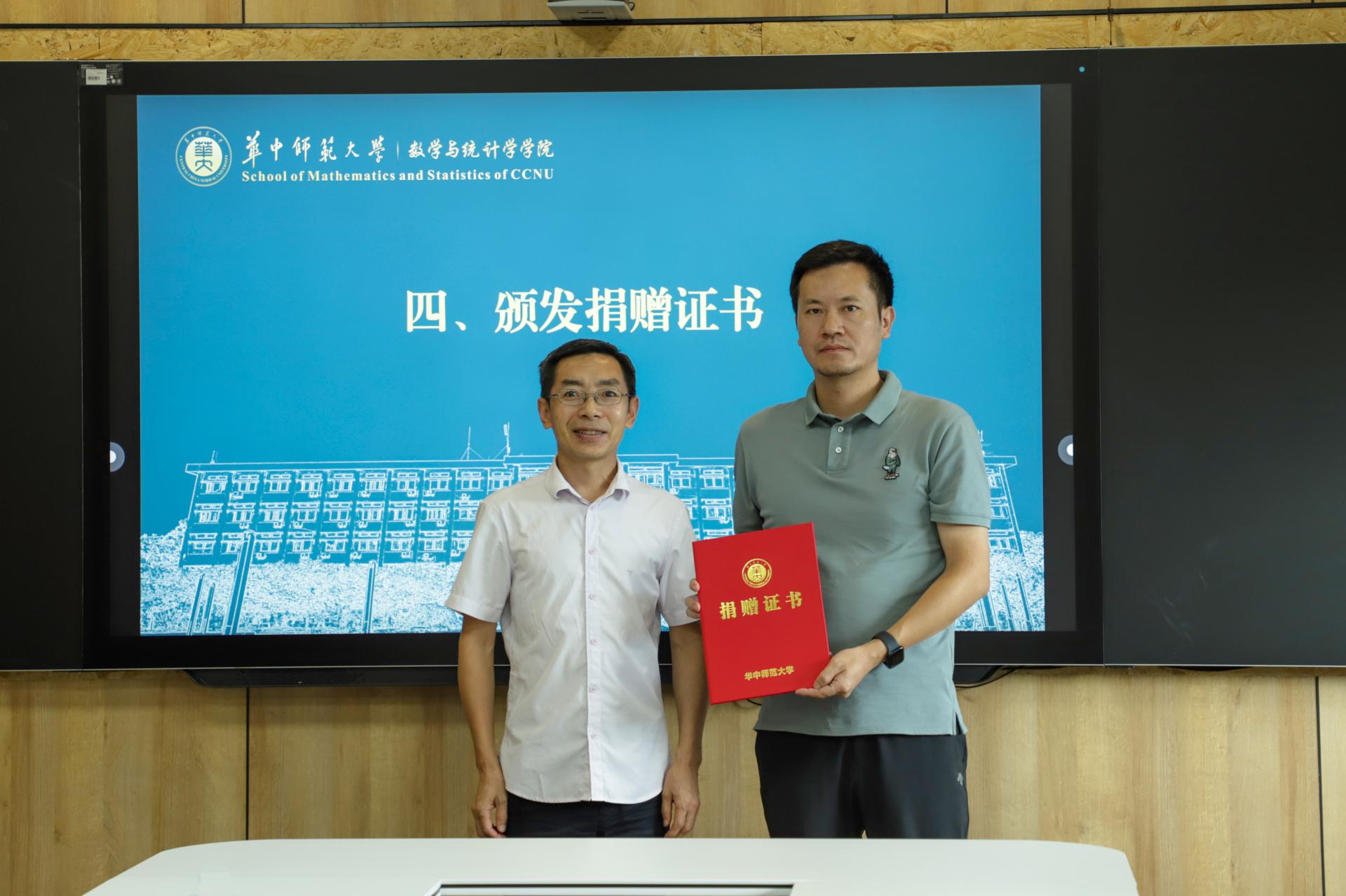 仪式上,数统学院2000级校友赵根以个人名义捐赠100万元,用于支持数统学院教育事业发展。校友办副主任周彦与赵根签署了捐赠协议,数统学院副院长左国新接收捐赠支票,党委副书记张军为赵根颁发捐赠证书。