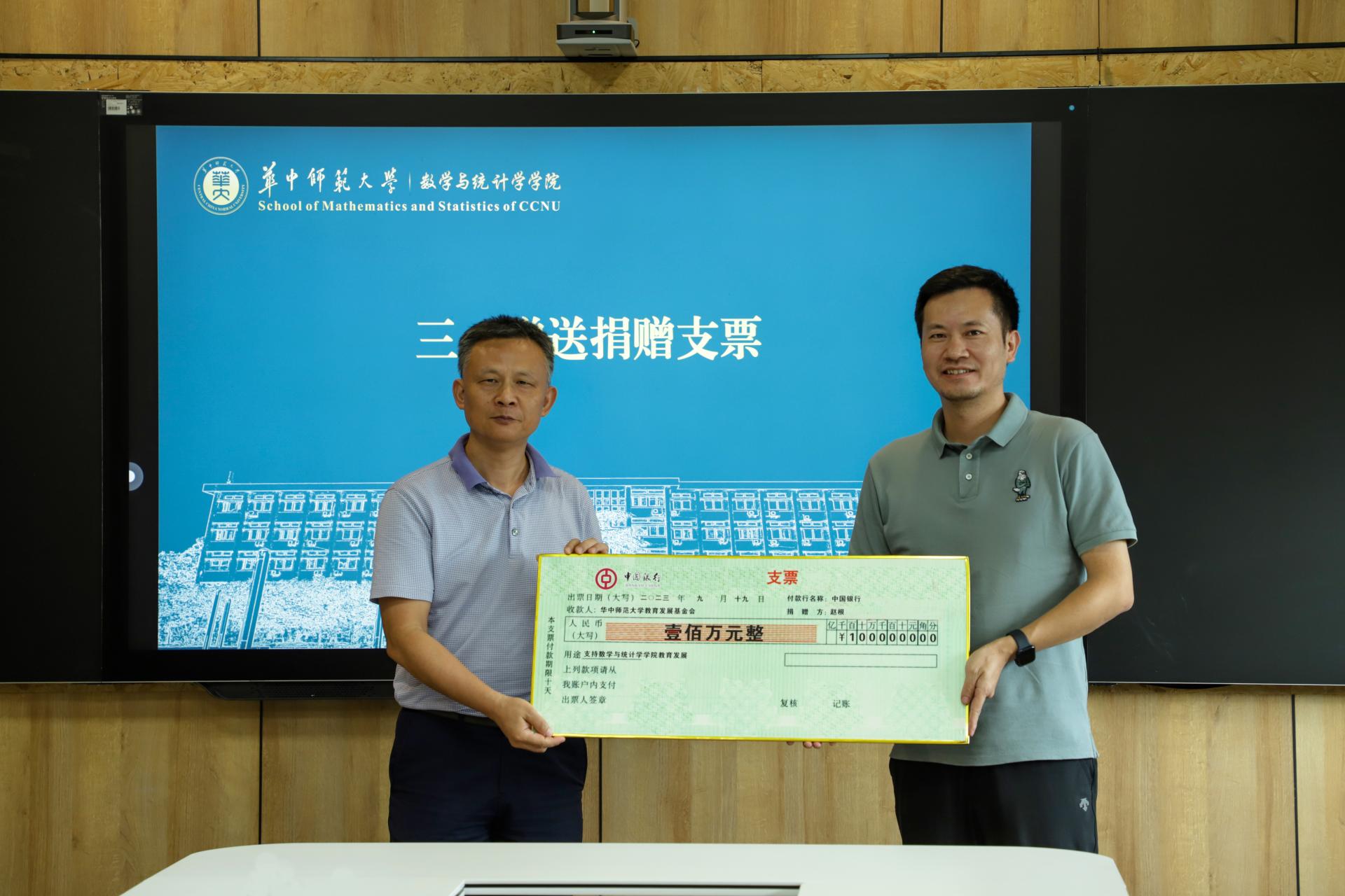 (通讯员 龙星宇)9月19日,“臻善”教育发展基金捐赠仪式在六号楼M323会议室举行。同创九鼎投资管理集团股份有限公司董事、副总经理、财务总监赵根,校党委副书记陈迪明出席,学校教育发展基金会、数学与统计学学院相关负责同志以及师生代表参加。