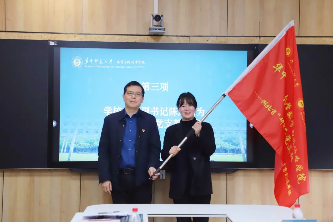 最后,校党委副书记陈迪明为湖北省“研究生样板党支部”数统学院博士生第二党支部授旗,并合影留念。