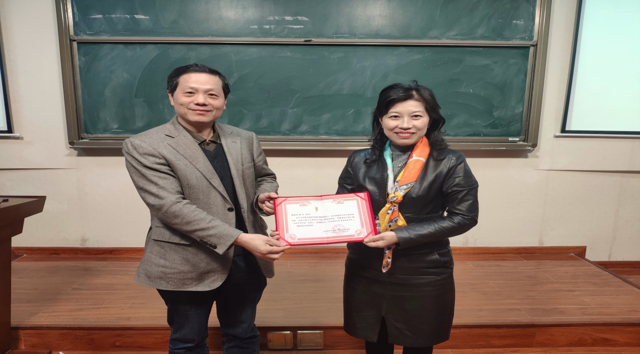 讲座开始,数统学院党委书记王中书记为钱江老师颁发证书,感谢钱老师的指导,同时号召同学们向钱老师学习,早日成长为一名优秀的中学数学教师。钱江老师以以“回眸•突围——我的成长之路”为主题,从成长、突围、学习三个方面讲述自身从教经历。首先,在成长方面,钱江老师将成长经历概括为三个阶段:拜师——赛课——求学。钱江老师直言在最初踏上讲台时,她也经历过彻夜备课、不断编写以及修正教案的历练时段,指导老师的严格要求,这些为钱江老师的教师成长之路奠定了坚实的基础。随后,钱江老师代表学校参加赛课,在赛课的过程中以赛促练,教学质量得到了质的飞跃。