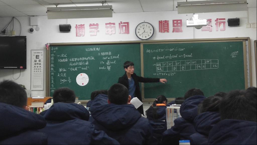 第一节课,刘运新老师对《任意角》一课中角、象限角、角的集合表示等内容进行知识串讲,并通过例题巩固的形式强调了任意角的相关性质。接着小组成员王茂林为班级学生带去《弧度制》一课。他在进行弧度制的授课之前首先回顾了角度制的定义,通过对珠穆朗玛峰高度的描述,对比引出弧度制引入的必要性。然后他通过引例,引导学生得出“圆心角不变则弧长和半径的比值不变”这一结论。进一步引出弧度角的定义和弧长公式。接着,他带领同学探索了特殊角,通过例题强化同学们角度数与弧度数的互化能力,接下来通过例题,教会学生如何用弧度制表示角的集合,并进一步巩固了弧长公式和推导出了扇形公式。在授课最后,他对本堂课进行了简单小结。
