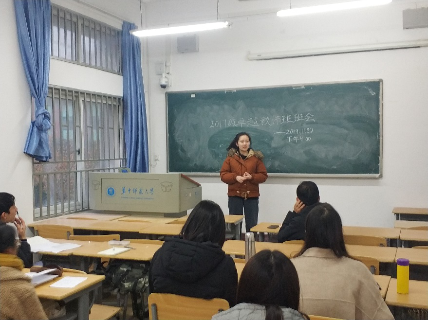 接着胡老师对2017级卓越教师班参加最佳师范生集体评选活动发表了看法。首先他祝贺班级以总分第一的好成绩获评最佳师范生集体荣誉称号。胡老师说他从这次活动评选中看出了卓越教师班每一位同学都十分认真,干劲十足,具有无限的潜力。他希望每位同学将这股劲头用到所有领域上,时刻严格要求自己,牢记自己是卓越教师班的一员。