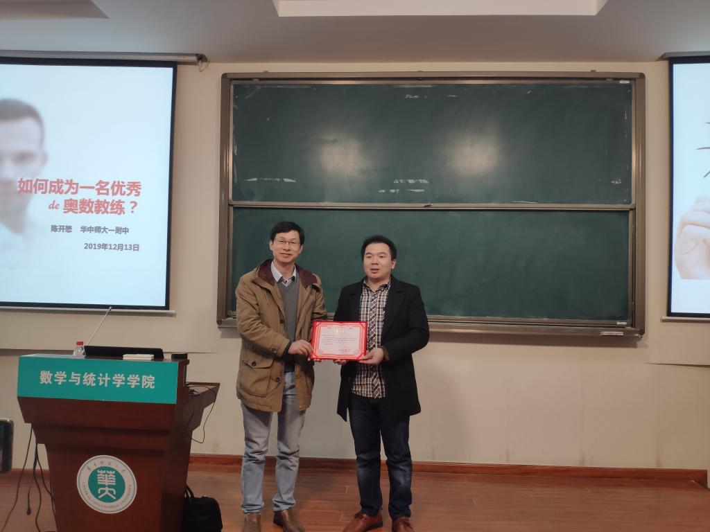 为更好的为师范生提供与竞赛名师的沟通交流机会,“数苑名师讲坛”第二十五讲于12月13号下午在6401报告厅隆重举行。本次讲座的主讲人是华中师范大学一附中高中部的陈开懋教练,曾获“武昌区优秀青年教师”,“华中师大一附中优秀班主任”,“华中师大一附中优秀教师”,“华中师大一附中课程改革先进个人”,“华中师大一附中研究性学习优秀指导教师”等荣誉称号。出席本次讲座的领导有华中师范大学数学与统计学学院刘宏伟副院长和教研室主任胡典顺教授。