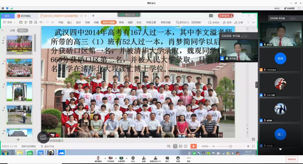 在为期五天的名师报告中,来自各中学、教育单位的九位优秀教师结合自身经验展开分享。在第一天,来自华师一附中的徐惠老师从“四注重”的教学理念、几个课堂教学实例、如何上好一节课、树立先进的教育理念及践行基础教育的改革五方面展开,结合自身的教育经历,为我们分享了她在高中数学课堂教学的探索与实践经历。接着,来自武汉四中的李文溢老师以班级管理为主题,介绍了班主任的主要工作内容,并提醒同学们在即将开展的教育实习过程中,要认真跟随指导老师学习班级管理方法,同时指出实习中班主任工作的常见误区,提醒同学们避免出现这些错误。在互动提问环节,同学们积极参与,提出内心疑惑,在名师的指导与解答中受益匪浅。