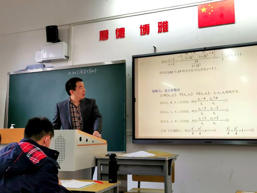 (通讯员 林康益)2021年12月10日上午,华中师范大学数学与统计学学院2019级卓越教师班第一小组赴华中师范大学第一附属中学高中部进行教育见习活动,旁听小组导师陈开懋给华师一附中竞赛班上的一节数学课。本节课的内容是“圆锥曲线中非对称韦达定理的突破技巧”。陈老师通过两道经典例题,向我们展现了八种针对非对称韦达定理题型的处理的有效策略。