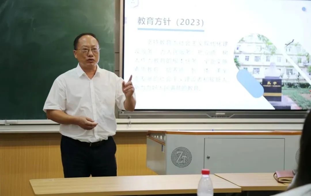 我院83级校友、长郡湘府中学党委书记杨万维作总结发言。初入教坛,他希望大家认真研读习近平总书记的“四有”好老师标准,即要有理想信念、有道德情操、有扎实学识、有仁爱之心,并向实习教师分享了2023年的教育方针及习近平总书记的教育思想。为引导实习生尽快适应学校教学工作,他为实习老师分享长郡湘府中学“一主体四要素”教学模式和“人与人、人与自然、人与社会”和谐发展的生态德育理念,分享学校教育教学经验。最后为大家分享了北京师范大学教授王文静《开学第一讲:师者如是》,引领大家争做“四有好老师”。