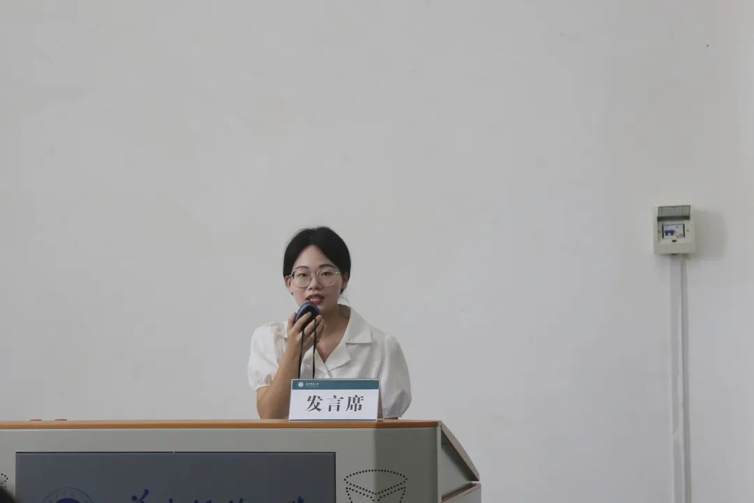 新生代表、2023级硕士研究生瞿莉面对研究生阶段的学习,结合自己的支教经历,向全体新同学们发出了三点倡议:一是要明确目标,自主学习;二是要珍惜时间,合理计划;三是要积极乐观,保持初心。她坚信,在华中师范大学数学与统计学学院,只要大家敢于尝试和付出,定会收获一场精彩的学习之旅。