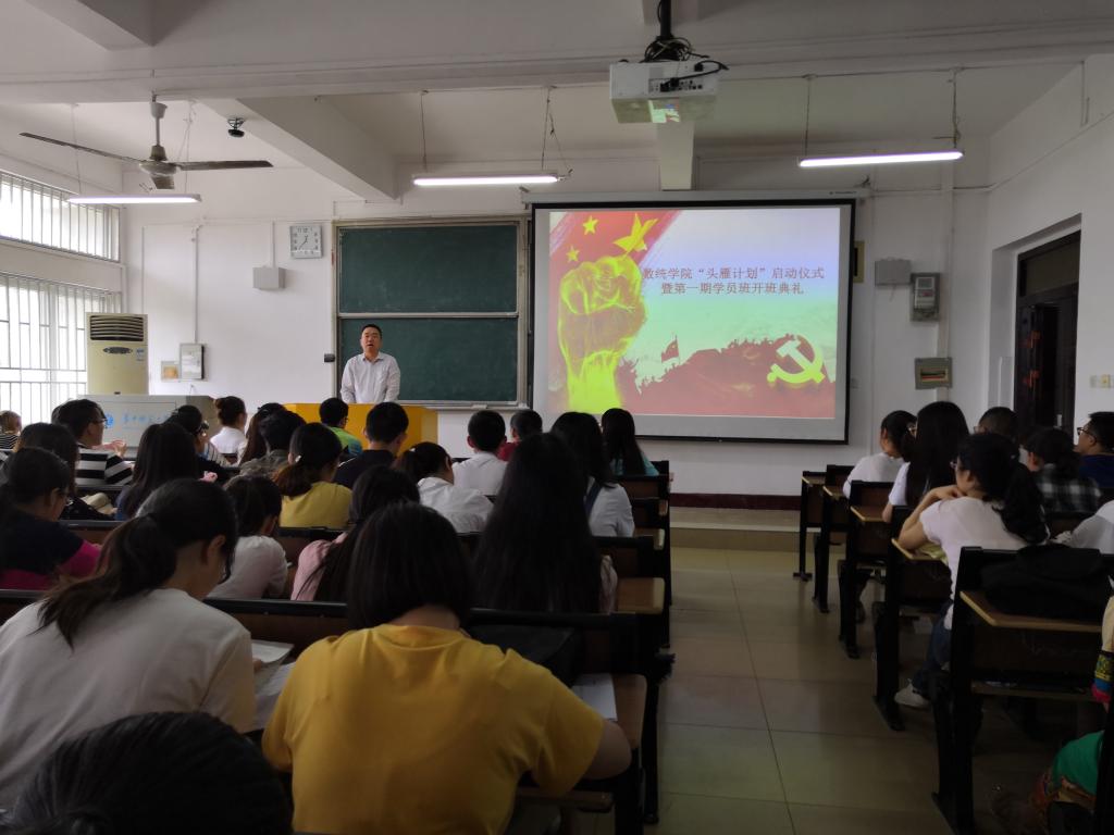 5月3日中午,我院 “头雁计划”启动仪式暨第一期学员班开班典礼在6301教室举行。数统学院党委副书记吴成峡、教授陈刚、2016级辅导员张凡以及21位“头雁计划”首批入选学员和一百多位入党积极分子参与活动。